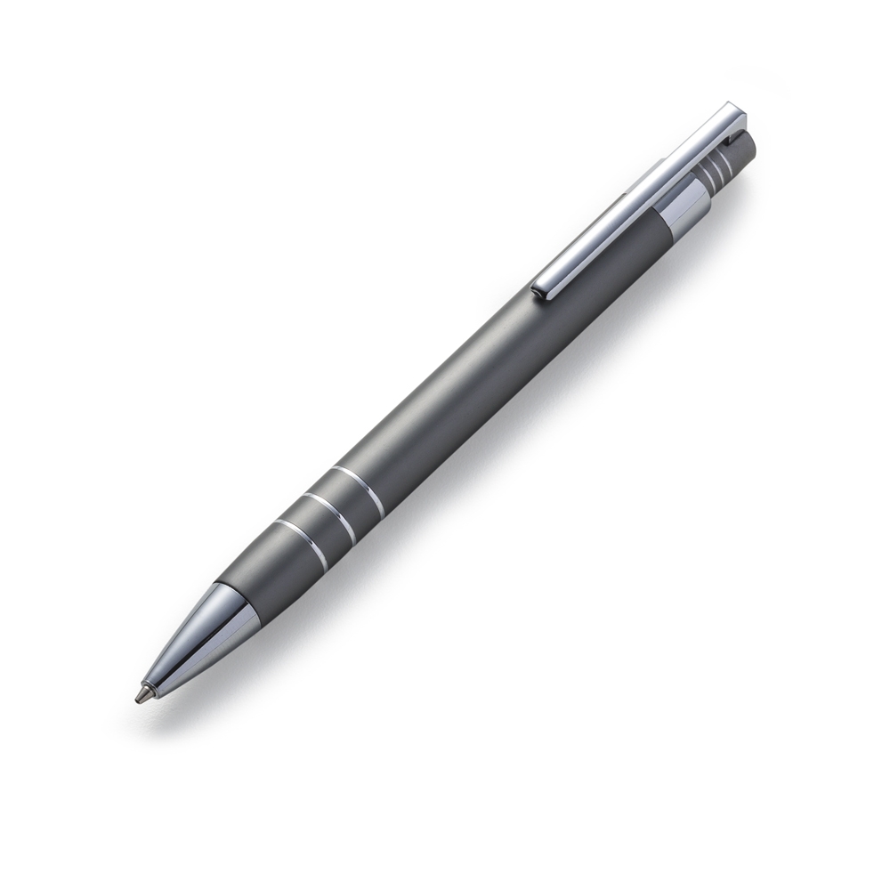 Lapiseira metal inteira colorida com detalhes prata. Clip metal e com três anéis na parte superior e outros três na parte inferior. Aciona por clique.